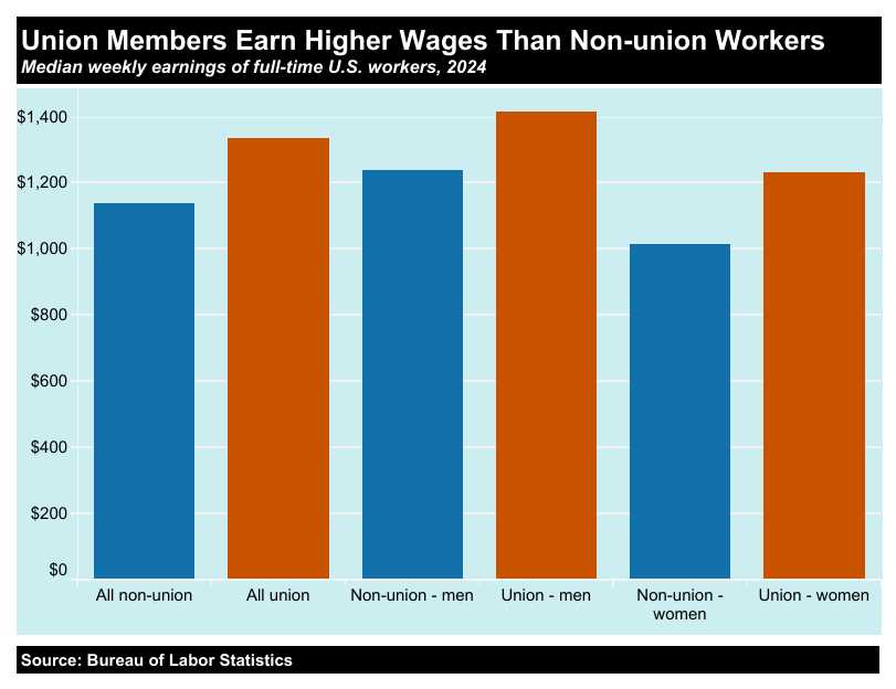 Temuan lain: melemahnya serikat pekerja turut memperlebar jurang pendapatan. Pada 2022, hanya 10,1 persen pekerja yang terwakili oleh serikat, turun dari lebih 30 persen pada 1940–1950. Pada saat yang sama, kelompok berpendapatan tertinggi semakin mampu memengaruhi aturan ekonomi. Pada 2018, 1 persen penduduk terkaya memperoleh lebih dari 20 persen total pendapatan nasional. Bureau of Labor Statistics menunjukkan bahwa pekerja anggota serikat memperoleh upah jauh lebih tinggi, terutama perempuan: pada 2024 perempuan anggota serikat mendapat upah mingguan median 1.232 dolar—216 dolar lebih tinggi dibanding perempuan tidak berserikat.