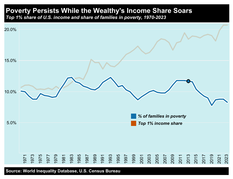 Laporan Institute for Policy Studies di inequality.org menunjukkan bahwa 1 persen orang Amerika terkaya menikmati pertumbuhan pendapatan jauh lebih cepat dibanding kelompok lain. Antara 1979–2021, pendapatan rata-rata 0,01 persen rumah tangga terkaya tumbuh hampir 27 kali lebih cepat daripada pendapatan 20 persen kelompok terbawah. Congressional Budget Office (CBO), lembaga analisis nonpartisan, menyimpulkan bahwa pada 2021 pendapatan rata-rata 1 persen rumah tangga terkaya 139 kali lebih besar dibanding 20 persen terbawah.