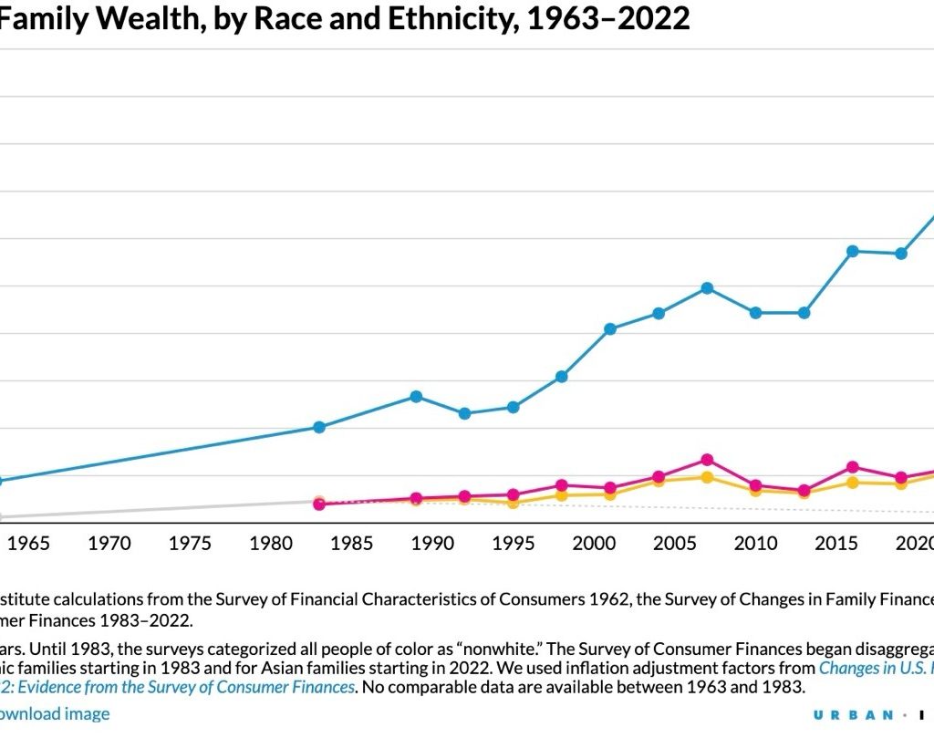 Kesenjangan pendapatan tidak hanya antara kaya dan miskin, tetapi juga antara ras. Urban’s Financial Well-Being Data Hub melaporkan bahwa dalam empat puluh tahun terakhir, kesenjangan kekayaan antara keluarga kulit putih, kulit hitam, dan Hispanik semakin melebar. Pada 1983, keluarga kulit putih memiliki kekayaan sekitar 320.000 dolar lebih banyak daripada keluarga kulit hitam dan Hispanik. Pada 2022, kekayaan rata-rata keluarga kulit putih mencapai 1,4 juta dolar—lebih dari 1 juta dolar lebih tinggi daripada keluarga kulit hitam (211.596 dolar) dan Hispanik (227.544 dolar). Mereka menyimpulkan bahwa: