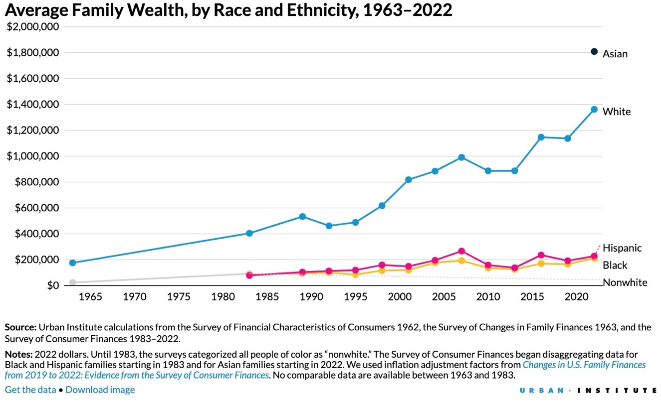 Kesenjangan pendapatan tidak hanya antara kaya dan miskin, tetapi juga antara ras. Urban’s Financial Well-Being Data Hub melaporkan bahwa dalam empat puluh tahun terakhir, kesenjangan kekayaan antara keluarga kulit putih, kulit hitam, dan Hispanik semakin melebar. Pada 1983, keluarga kulit putih memiliki kekayaan sekitar 320.000 dolar lebih banyak daripada keluarga kulit hitam dan Hispanik. Pada 2022, kekayaan rata-rata keluarga kulit putih mencapai 1,4 juta dolar—lebih dari 1 juta dolar lebih tinggi daripada keluarga kulit hitam (211.596 dolar) dan Hispanik (227.544 dolar). Mereka menyimpulkan bahwa: