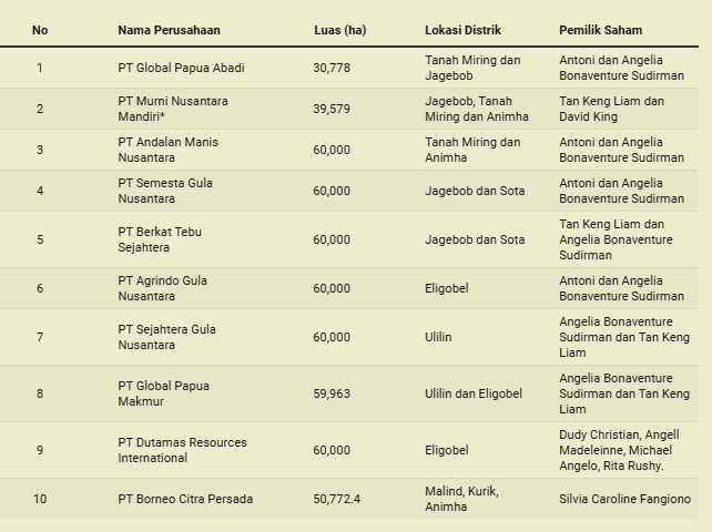 Di Merauke, Papua, sejumlah konglomerat terlibat dalam Proyek Strategis Nasional (PSN) Tebu. Salah satunya adalah Andi Syamsuddin Arsyad, atau yang dikenal sebagai Haji Isam, melalui Jhonlin Group, yang mengerahkan ribuan alat berat untuk meratakan sekitar satu juta hektare lahan dalam proyek cetak sawah dan pengembangan tebu, dengan dukungan militer di lapangan. Selain itu, sepuluh perusahaan lainnya memperoleh konsesi lahan seluas sekitar 500 ribu hektare untuk pengembangan industri gula dan bioetanol.