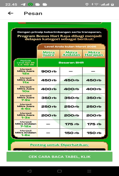 Yang lebih mengungkap adalah kenyataan bahwa implementasi oleh platform menyimpang dari formula berbasis penghasilan yang ditetapkan dalam surat edaran. Dalam praktiknya, Gojek mendistribusikan BHR melalui sistem penjenjangan berbasis kinerja — Mitra Juara, Mitra Andalan, Mitra Harapan — dengan nominal tetap berkisar antara Rp 150.000 hingga Rp 900.000, tergantung pada metrik kinerja dan pencapaian level secara berulang. Skema ini menyimpang dari formula 25 persen dalam tiga hal yang krusial: