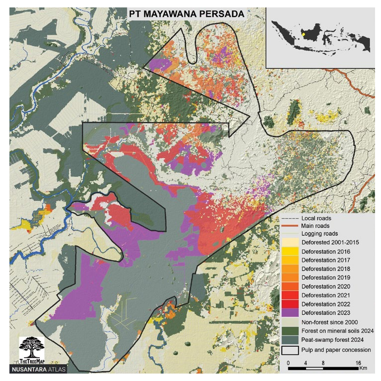 DALAM 5 tahun terakhir, ekspansi Hutan Tanaman Industri (HTI) mengalami perluasan masif di Provinsi Kalimantan Barat. Akibatnya, deforestasi tidak terhindarkan. Peningkatan drastis deforestasi di konsesi HTI, tak lain dipicu oleh pembukaan hutan untuk dialihfungsi menjadi perkebunan kayu milik PT Mayawana Persada (selanjutnya MP), anak usaha Alas Kusuma Group. Berdasarkan Izin Usaha Pemanfaatan Hasil Hutan Kayu Hutan Tanaman Industri (IUPHHK-HTI) melalui SK Nomor 724/Menhut-II/2010 tanggal 30 Desember 2010, total konsesi PT MP seluas 136.710 hektar. Ini mencakupi 14 Desa, yang membentang dari Kabupaten Ketapang dan Kabupaten Kayong Utara dengan masa konsesi diperkirakan selama 60 tahun.